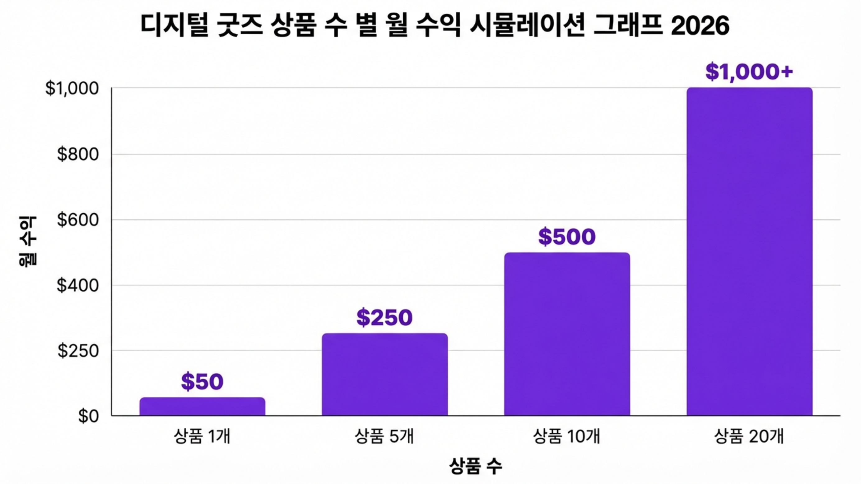 Alt Text: "디지털 굿즈 상품 수 별 월 수익 시뮬레이션 그래프 2026"