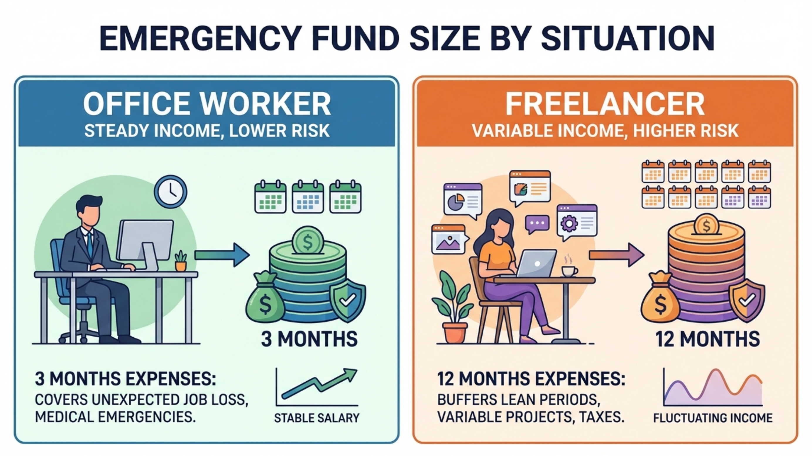 Alt Text: "상황별 비상금 규모 직장인 3개월 프리랜서 12개월 기준 인포그래픽"
