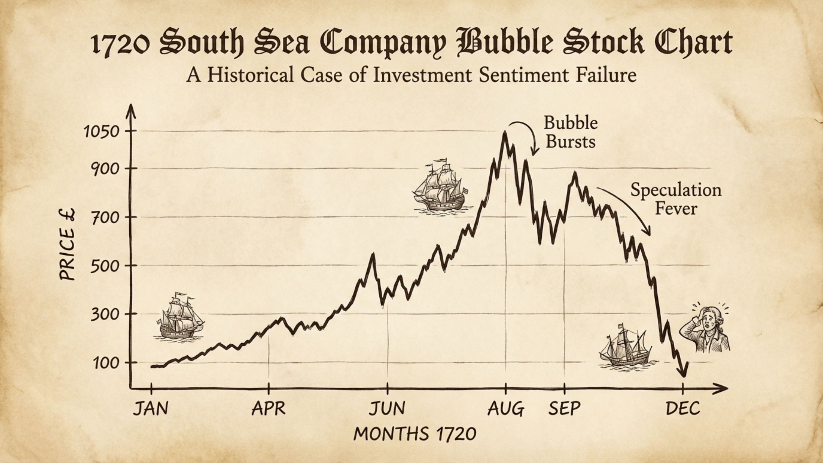 1720년, 영국 남해회사(South Sea Company) 주가가 단 9개월 만에 10배 가까이 폭등했습니다. 뉴턴은 초기에 주식을 매수해 상당한 수익을 올리고 매도했습니다. 그러나 주변 사람들이 계속 돈을 버는 것을 지켜보며 더 높은 가격에 재진입했고, 버블 붕괴와 함께 당시 돈으로 약 2만 파운드를 잃었습니다. 현재 가치로 수백만 달러에 달하는 금액이었습니다.